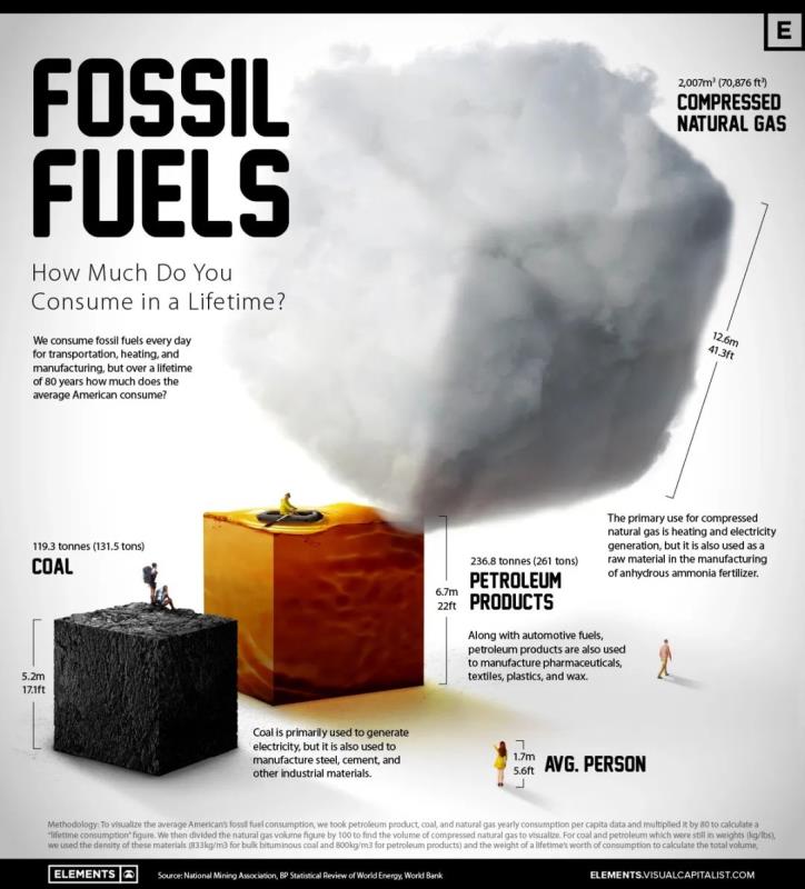 中國儲(chǔ)能網(wǎng)訊:Virtual Capialist使用美國國家礦業(yè)協(xié)會(huì)(National Mining Association)和英國石油公司(BP)的《世界能源統(tǒng)計(jì)評(píng)論》(Statistical Review of World Energy)提供的數(shù)據(jù),以信息圖顯示一個(gè)美國人一生(80年的壽命)中化石燃料的消費(fèi)量——平均消費(fèi)120噸煤、237噸石油產(chǎn)品、2007立方米天然氣。