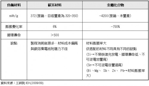 目前的碳系負(fù)極材料可分為人造石墨、改質(zhì)天然石墨以及MCMB(Mesocarbon Micro-beads)基于成本考慮,目前以人造石墨、改質(zhì)天然石墨使用的較多。至于能夠具有相當(dāng)大電容量的金屬化合物,基于循環(huán)壽命以及材料膨脹比率大的缺點(diǎn),所以使用情況并不多。碳系材料有其理論的電容量極限值372mAh/g,而且目前的發(fā)展已接近極限值,所以各個廠商都期望可以透過將負(fù)極材料改質(zhì)成為金屬化合物,以一舉提高鋰電池的電容量。碳系以及金屬化合物的負(fù)極材料比較如表二。