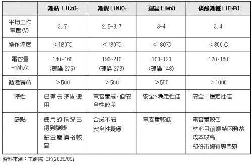 鋰電池可依正極材料的不同,分為鋰鈷電池(LiCoO2)、鋰錳電池(LiMnO2)、鋰鎳電池(LiNiO2)及磷酸鋰鐵電池(LiFePO4)。當(dāng)中鋰鈷電池以應(yīng)用于手持式裝置電子產(chǎn)品為主,而鋰鎳電池因?yàn)榘踩陨形纯朔?,所以目前生產(chǎn)者以及使用者都很少,而鋰錳電池因?yàn)榫哂械碾娙萘?、安全…等特性,讓其目前廣泛應(yīng)用在手工具當(dāng)中,至于最近發(fā)展的磷酸鋰鐵電池,雖然有相當(dāng)良好的安全性,且被視為應(yīng)用在車輛的明日之星,不過因?yàn)闊Y(jié)不易以及電動車市場未普及的問題,所以目前市場比重仍低。主要正極材料特性的比較如表一。