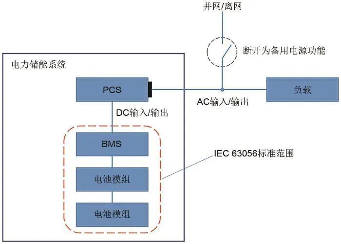 IEC 63056在IEC 62619的基礎(chǔ)上,規(guī)定了最大直流電壓不超過(guò)1500 V的電能存儲(chǔ)系統(tǒng)的附加要求和特殊要求,增加了異常高溫、反接保護(hù)、過(guò)放保護(hù)、運(yùn)輸安裝時(shí)的電氣絕緣和短路保護(hù)以及安裝運(yùn)維時(shí)的跌落等測(cè)試要求。圖1為IEC 63056適用范圍示意圖。