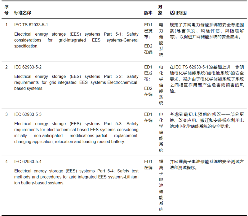 IEC 62933-5明確了接入電網(wǎng)的儲(chǔ)能系統(tǒng)全生命周期過(guò)程中的安全注意事項(xiàng),提供了儲(chǔ)能系統(tǒng)的危險(xiǎn)因素、風(fēng)險(xiǎn)評(píng)估和降低危害的必要措施以及相應(yīng)的測(cè)試驗(yàn)證。