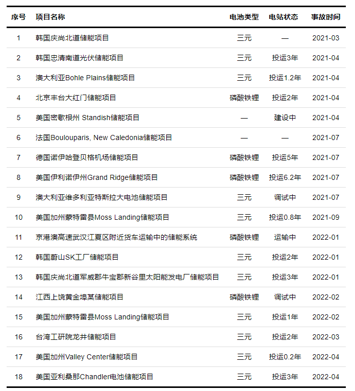 從項(xiàng)目狀態(tài)來(lái)看,投運(yùn)1年及以上的事故10起,投運(yùn)不足1年的2起,運(yùn)輸中1起,建設(shè)調(diào)試中的3起,其余2起狀態(tài)未知;從電池類(lèi)型來(lái)看,其中三元鋰離子電池事故最多,共11起,磷酸鐵鋰5起,其余2起電池類(lèi)型未知。
