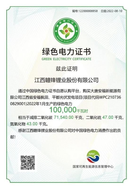 中國儲(chǔ)能網(wǎng)訊:8月10日,贛鋒鋰業(yè)與江西大唐國際新余發(fā)電有限責(zé)任公司完成江西省內(nèi)首筆無補(bǔ)貼綠證交易,由贛鋒向江西大唐國際購買100MW的綠色電力證書,以提升企業(yè)運(yùn)營過程中的清潔能源比例。