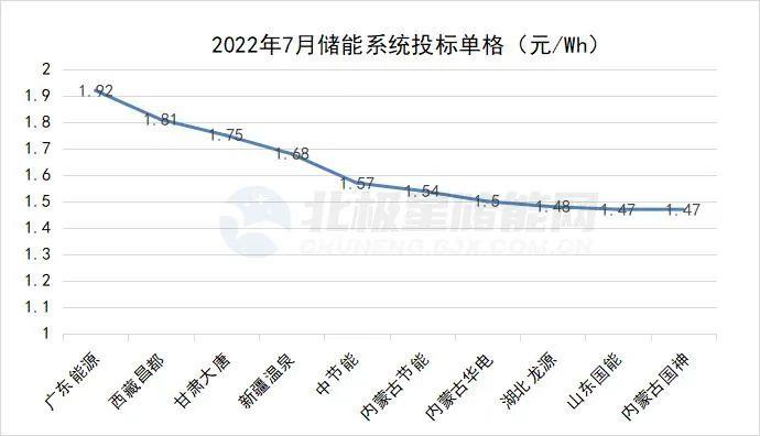 2022年7月儲能EPC總承包規(guī)模超830MW/1830MWh,投標(biāo)報價在1.42元/Wh到3.07元/Wh之間,除去山西應(yīng)縣獨立儲能項目、寧夏利通區(qū)同利變新型電化學(xué)儲能電站EPC、大唐儲能輔助調(diào)頻設(shè)備EPC開標(biāo)價格超過2元/Wh,其余儲能項目EPC投標(biāo)均價為1.66元/Wh,較上個月的1.75元/Wh有下降趨勢。其中中國電建成功摘得貴冠,先后拿下了5個項目,投標(biāo)總價超6.8億。