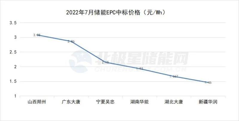 其中山西應(yīng)縣獨立儲能項目EPC招標(biāo)中,湖北省電力勘測設(shè)計院有限公司、中國電建集團(tuán)江西省水電工程局有限公司聯(lián)合體投標(biāo)報價3.07元/Wh,是七月份已知最高報價。