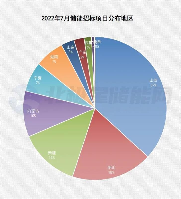 2022年7月,共有38個儲能項目開標(biāo)、總規(guī)模約3.09GWh。從地域來看,43個項目分布于山西、寧夏、湖北、內(nèi)蒙古、甘肅、河南等12省區(qū)。其中山西儲能項目采購規(guī)模最大,共計4個儲能項目總規(guī)模超700MW/1100MWh。