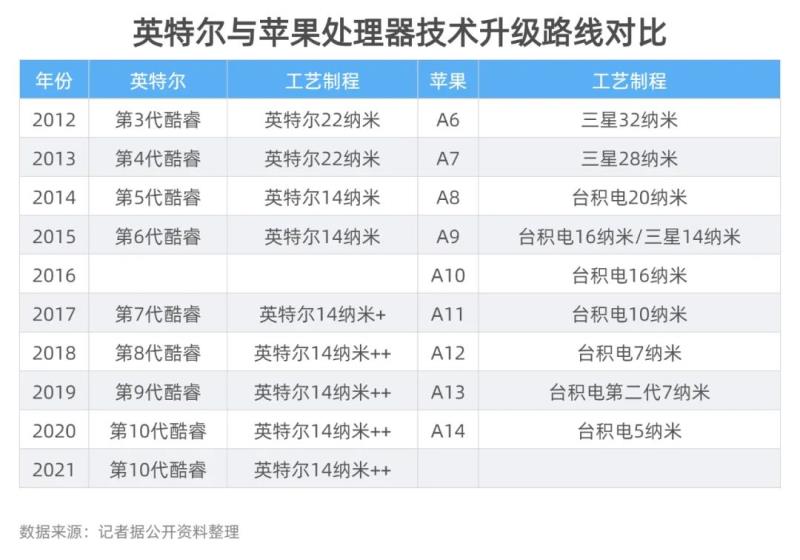 2012年~2020年,蘋果A系列處理器制程水平持續(xù)升級(jí),從32納米一直升級(jí)到5納米。而英特爾,本來應(yīng)按照“Tick-Tock”[4] 鐘擺模型的迭代策略,一年更新制程工藝,一年更新微處理器架構(gòu),即兩年更新一次制程工藝。然而,英特爾2015年開始使用14納米,直到2021年,還是使用14納米及其衍生系列。