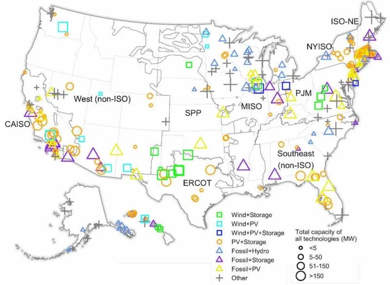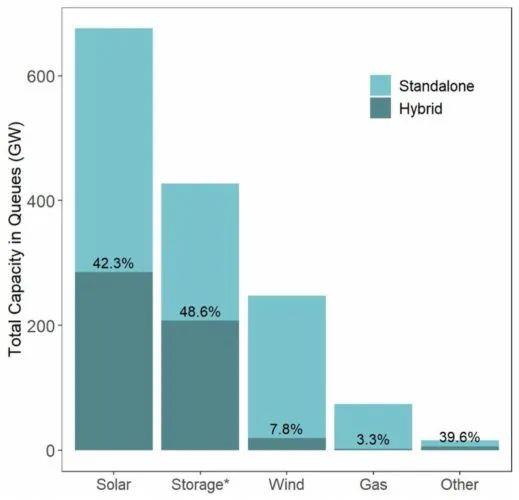 正在開發(fā)的發(fā)電廠的數(shù)據(jù)表明,混合發(fā)電廠蓬勃發(fā)展的趨勢可能會持續(xù)下去:該報告指出,截至2021年底,全美超過670GW的能量來自太陽能發(fā)電廠,其中42%來自混合發(fā)電廠。風(fēng)力發(fā)電方面,以247GW的發(fā)電能力位居其后,其中僅8%來自混合動力發(fā)電,大多數(shù)則來自于“風(fēng)電+儲能”發(fā)電。不過值得注意的是,許多擬建的混合發(fā)電廠還未投入商業(yè)運營。