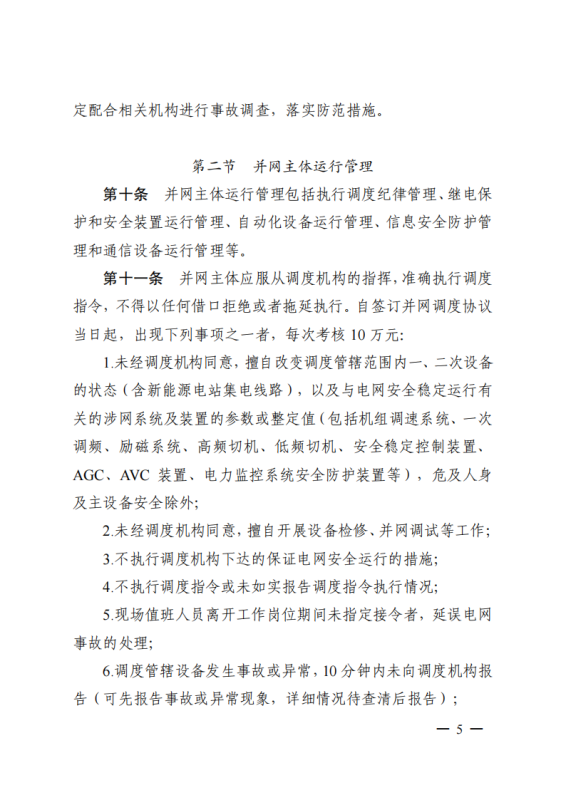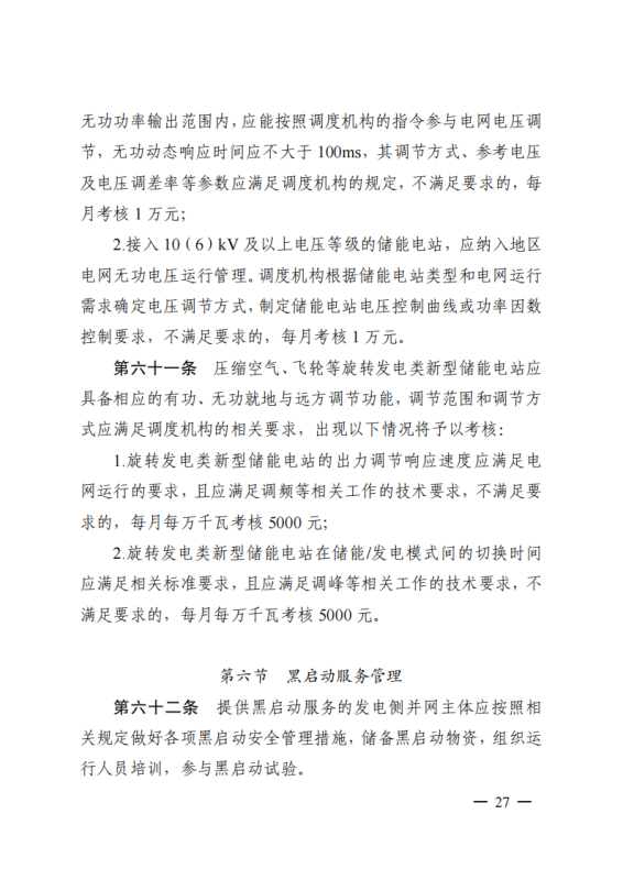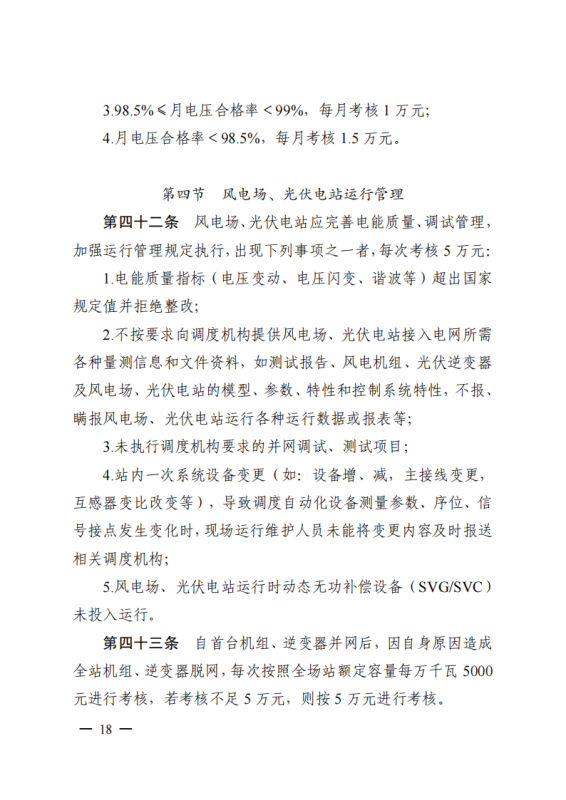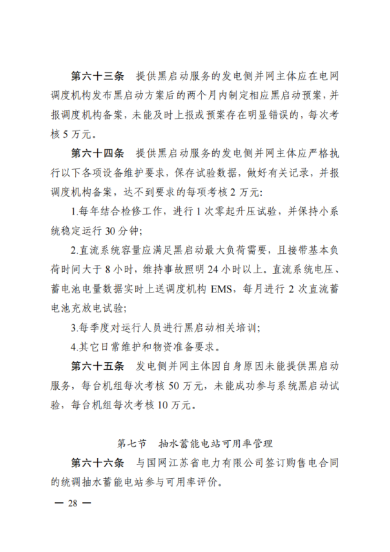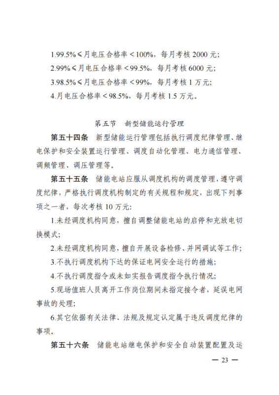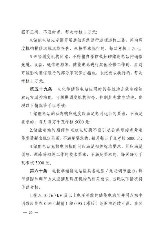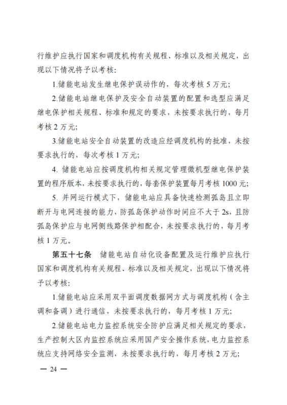 其中,《江蘇電力并網(wǎng)運(yùn)行管理實(shí)施細(xì)則》單獨(dú)設(shè)置“新型儲(chǔ)能運(yùn)行管理”、“抽水蓄能電站可用率管理”章節(jié),明確要求儲(chǔ)能電站應(yīng)服從調(diào)度機(jī)構(gòu)的調(diào)度管理,出現(xiàn)各類違規(guī)情況將需要支付考核費(fèi)用:如出現(xiàn)擅自調(diào)整儲(chǔ)能電站的啟停和充放電切換模式、擅自開(kāi)展設(shè)備檢修并網(wǎng)調(diào)試工作、或值班人員離守延誤電網(wǎng)事故處理等情況,每次考核10萬(wàn)元;如儲(chǔ)能電站發(fā)生繼電保護(hù)誤動(dòng)作的,每次考核5萬(wàn)元;儲(chǔ)能電站繼電保護(hù)及安全自動(dòng)裝置的配置和選型未按要求執(zhí)行的,每月考核2萬(wàn)元。