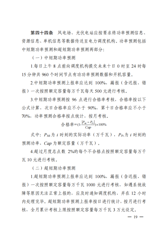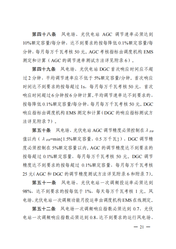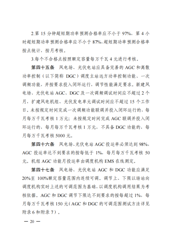 電化學(xué)儲(chǔ)能電站應(yīng)同時(shí)具備就地充放電控制和遠(yuǎn)方遙控功能,可根據(jù)調(diào)度機(jī)構(gòu)指令,控制其充放電功率,出現(xiàn)以下情況將予以考核:儲(chǔ)能電站的動(dòng)態(tài)響應(yīng)速度應(yīng)滿足電網(wǎng)運(yùn)行的要求,不滿足要求的,每月每萬(wàn)千瓦考核 5000 元;儲(chǔ)能電站的啟停和充放電切換不應(yīng)引起公共連接點(diǎn)處電能質(zhì)量超出規(guī)定范圍,不滿足要求的,每月每萬(wàn)千瓦考核 5000 元;儲(chǔ)能電站充放電切換時(shí)間應(yīng)滿足相關(guān)標(biāo)準(zhǔn)要求,且應(yīng)滿足調(diào)頻、調(diào)峰等相關(guān)工作的技術(shù)要求,不滿足要求的,每月每萬(wàn)千瓦考核5000 元。