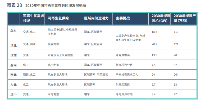 考慮到傳統(tǒng)產(chǎn)業(yè)轉(zhuǎn)型速度、自然資源稟賦、可再生氫能利用程度等因素,2030年中國(guó)可再生氫生產(chǎn)裝機(jī)在各區(qū)域之間的分布模式將呈現(xiàn)以下特點(diǎn):