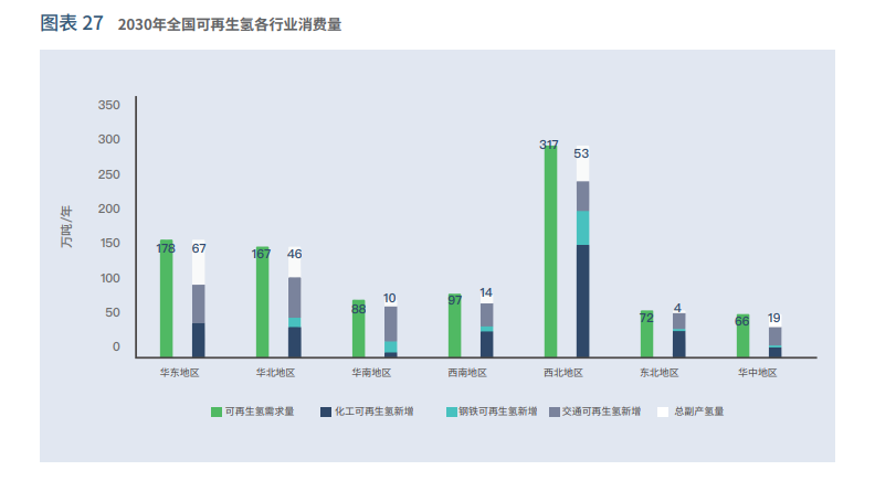 根據(jù)測(cè)算,2030年,化工行業(yè)總可再生氫消費(fèi)量將達(dá)到376萬(wàn)噸,是中國(guó)最大的可再生氫需求市場(chǎng)。其中,西北地區(qū)由于具備化工產(chǎn)業(yè)及可再生電力資源優(yōu)勢(shì),將成為最大的化工可再生氫消費(fèi)地,其次分別是華東、東北和西南地區(qū)。