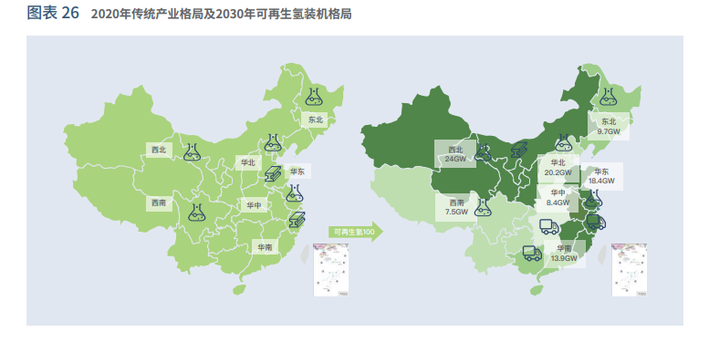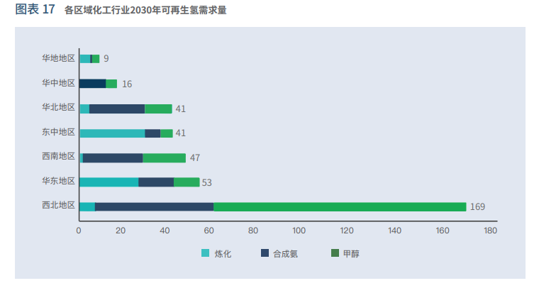 傳統(tǒng)產(chǎn)業(yè)轉(zhuǎn)型升級(jí)的需求和可再生資源自然稟賦相匹配的區(qū)域,將成為可再生氫的重要發(fā)展基地,裝機(jī)規(guī)模相對(duì)較大,可獲取較低成本的可再生氫,如西北、西南、東北地區(qū)。