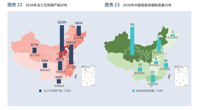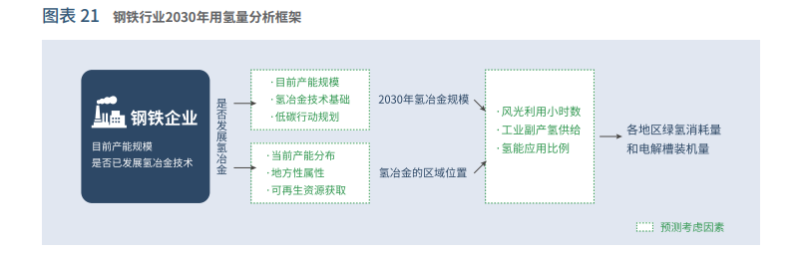 近年來(lái)國(guó)內(nèi)各個(gè)大型鋼鐵企業(yè)氫冶金技術(shù)工藝試點(diǎn)項(xiàng)目如圖表20所示?;谏鲜隹紤],對(duì)氫冶金項(xiàng)目產(chǎn)能的規(guī)模和區(qū)域位置進(jìn)行估算,并結(jié)合不同地區(qū)電解槽的利用小時(shí)和工業(yè)副產(chǎn)氫供給等因素確定各地區(qū)的可再生氫消耗量和電解槽裝機(jī)需求。