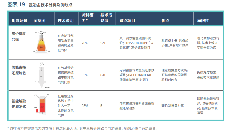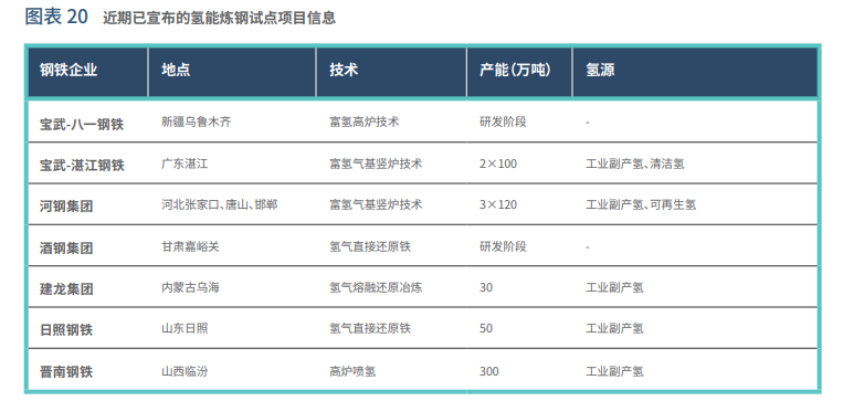 鋼鐵行業(yè)對(duì)可再生氫的利用集中在新增產(chǎn)能生產(chǎn)工藝流程,行業(yè)領(lǐng)先企業(yè)占據(jù)先發(fā)地位。根據(jù)不同煉鐵工藝,氫冶金的主要應(yīng)用場(chǎng)景可分為三類(lèi),如圖表19所示。