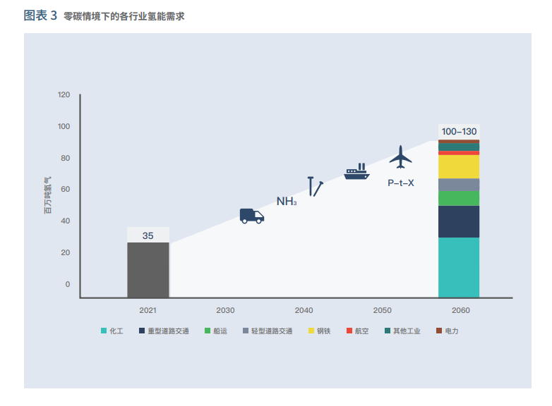 結(jié)合應(yīng)用場(chǎng)景、技術(shù)成本和未來(lái)中國(guó)零碳轉(zhuǎn)型的需求,在2060年碳中和情景下,氫能將在化工、鋼鐵、重型交通領(lǐng)域?qū)l(fā)揮關(guān)鍵的減碳作用,并在船運(yùn)、航空、其他重工業(yè)和電力儲(chǔ)能領(lǐng)域逐步拓展其應(yīng)用場(chǎng)景(如圖表3)。