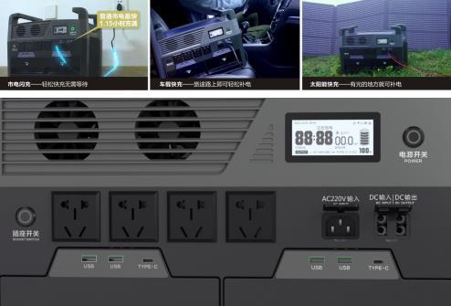 千乘動(dòng)力戶外便攜電站,輸入接口有1個(gè)220V 2000W交流充電接口、1個(gè)車載充電接口和1個(gè)太陽(yáng)能充電接口,充電方便快捷。最大充電功率3000W,最快可實(shí)現(xiàn)普通市電1.15小時(shí)充滿。輸出接口有4個(gè)220V純正弦波交流放電接口,2個(gè)12V/10A 120w點(diǎn)煙器接口,2個(gè)Type-C 100W快充接口,4個(gè)USB 5V/24A 12W接口, 可供99.9%各種大功率日常生活電器、戶外作業(yè)工具、3C電子設(shè)備使用及汽車電瓶補(bǔ)電,同時(shí)可直接為電動(dòng)汽車充電。
