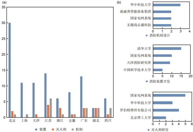 圖5(b)展示了儲能系統(tǒng)消防技術(shù)各領(lǐng)域的主要申請人,可以看出,關(guān)于儲能系統(tǒng)消防技術(shù)的專利申請主體和相關(guān)專利布局仍然主要來自高校研究所、事業(yè)單位、電力電池行業(yè)。其中,國家電網(wǎng)系統(tǒng)在儲能消防技術(shù)的裝置與系統(tǒng)研發(fā)、滅火劑開發(fā)方面都有較多布局且排名靠前,說明我國關(guān)于電化學儲能系統(tǒng)及相關(guān)支撐技術(shù)仍然處于商業(yè)化早期,需要有關(guān)單位的引領(lǐng)探索;其次,儲能系統(tǒng)消防各領(lǐng)域技術(shù)研發(fā)及專利申請主體為清華大學、華中科技大學、天津消防研究所等高校與研究所,說明相關(guān)技術(shù)對研究者的研究水平要求較高。應(yīng)當推進產(chǎn)學研一體化進程,加快研究成果落地,為新能源產(chǎn)業(yè)推廣保駕護航。