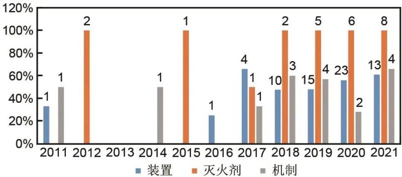 圖4 儲能系統(tǒng)消防各領(lǐng)域發(fā)明專利年申請量及占比