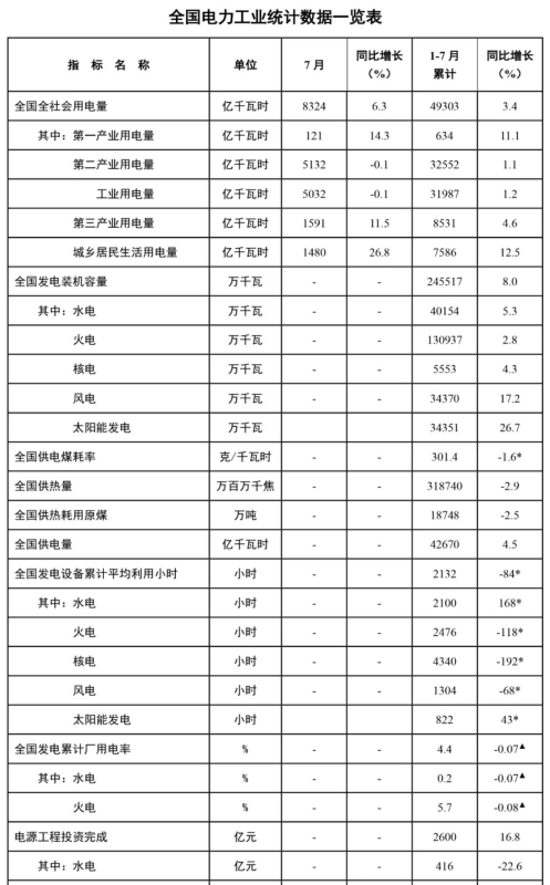 1-7月份,全國發(fā)電設備累計平均利用2132小時,比上年同期減少84小時。其中,火電2476小時,比上年同期減少118小時;核電4340小時,比上年同期減少192小時;風電1304小時,比上年同期減少68小時。