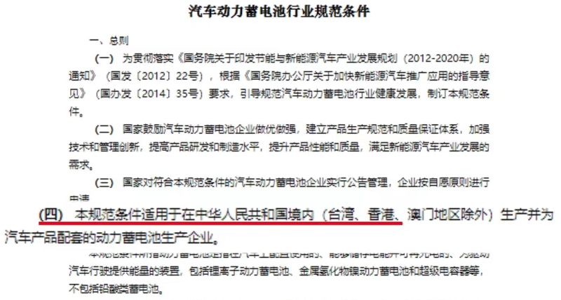 同年4月,工信部又發(fā)布了《汽車動(dòng)力蓄電池行業(yè)規(guī)范條件》。這份俗稱“白名單”的文件對(duì)相關(guān)企業(yè)設(shè)定了門檻,比如產(chǎn)能要在2億瓦時(shí)以上;比如整車廠想要拿到財(cái)政補(bǔ)貼,就必須用白名單上企業(yè)提供的電池。同時(shí)進(jìn)一步劃定了適用范圍為中華人民共和國(guó)境內(nèi)。