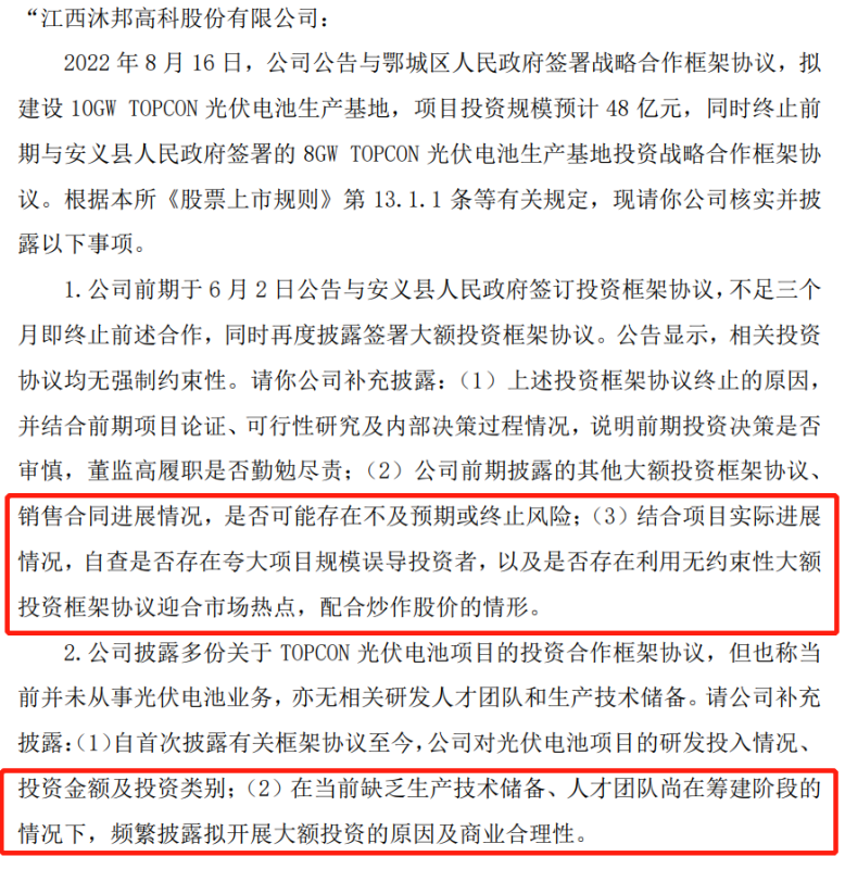 這引得上交所接連質(zhì)疑是否存在夸大項目規(guī)模誤導(dǎo)投資者,是否存在利用無約束性大額投資框架協(xié)議迎合市場熱點,配合炒作股價。