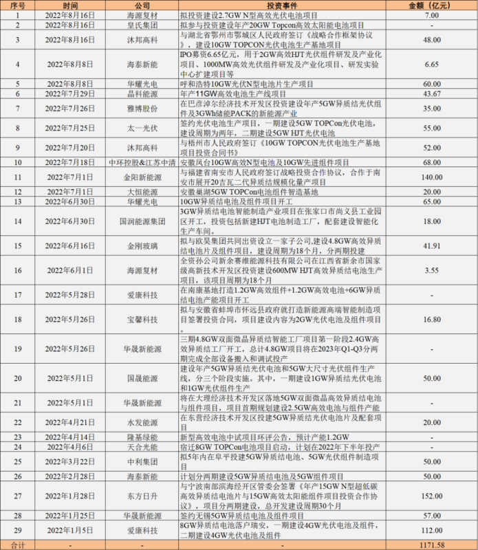 圖:今年以來國內(nèi)N型電池技術(shù)項目投資情況梳理