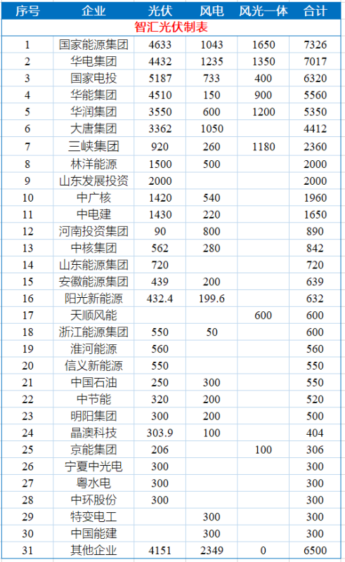 4)從投資企業(yè)來看,國家能源集團、華電集團均超過7GW,各企業(yè)獲得的規(guī)模如下表所示: