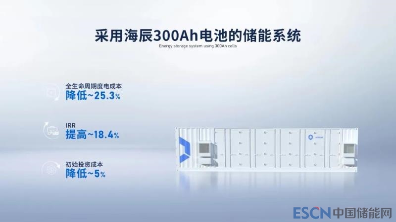 采用海辰儲能300Ah電力儲能專用電池的儲能系統(tǒng),相較當(dāng)下280Ah儲能電池,可以實(shí)現(xiàn)全生命周期度電成本降低25.3%;如果以用戶側(cè)儲能電站,按照一天一充應(yīng)用場景下,可實(shí)現(xiàn)IRR(內(nèi)部收益率)提高18.4%;前三年儲能系統(tǒng)總放電量增加5%,從而減少電量超配,實(shí)現(xiàn)初始投資節(jié)省5%。該款產(chǎn)品從以上三個方面帶來顯著收益,縮短儲能項(xiàng)目回本周期,大幅提升投資回報率。