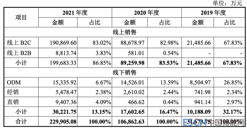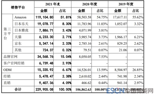 從公司的銷售渠道來(lái)看,公司目前的銷售以線上電商為主,公司主要通過(guò)亞馬遜、日本樂天、日本雅虎、天貓及京東等國(guó) 內(nèi)外知名第三方電商平臺(tái)銷售產(chǎn)品,報(bào)告期內(nèi)公司通過(guò)電商平臺(tái)開展的線上銷售的銷售額占主營(yíng)業(yè)務(wù)收入比重分別為 67.83%、85.53%和 86.85%。