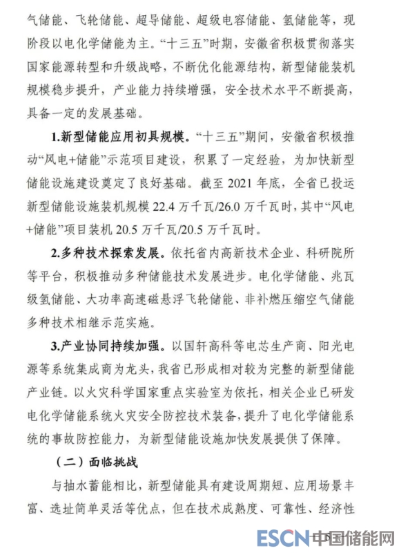《方案》對(duì)安徽省的現(xiàn)有儲(chǔ)能裝機(jī)規(guī)模進(jìn)行了統(tǒng)計(jì),對(duì)擬建、在建的儲(chǔ)能電站進(jìn)行了全面梳理,截至2021 年底,安徽省已投運(yùn)新型儲(chǔ)能設(shè)施裝機(jī)規(guī)模22.4 萬(wàn)千瓦/26.0 萬(wàn)千瓦時(shí),其中“風(fēng)電+儲(chǔ)能”項(xiàng)目裝機(jī)20.5 萬(wàn)千瓦/20.5 萬(wàn)千瓦時(shí)。