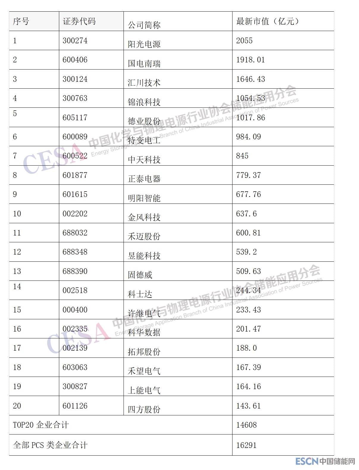 從中國化學與物理電源行業(yè)協(xié)會儲能應用分會政策研究中心觀察的260余家儲能上市公司名單看,涉及儲能PCS生產(chǎn)的企業(yè)有49之多,其他非上市公司亦不在少數(shù),如南瑞繼保、冠隆電力、英博電氣、古瑞瓦特、索英電氣等出貨量大且創(chuàng)新能力強的企業(yè),國內(nèi)PCS廠家合計已達80余家,相應外資品牌有20余家,整個市場上PCS廠家已超過100家。據(jù)CESA儲能應用分會產(chǎn)業(yè)政策研究中心對儲能PCS上市公司統(tǒng)計,2022年儲能PCS類上市公司總市值已達1.63萬億元,其中TOP20企業(yè)總市值如下表所列。