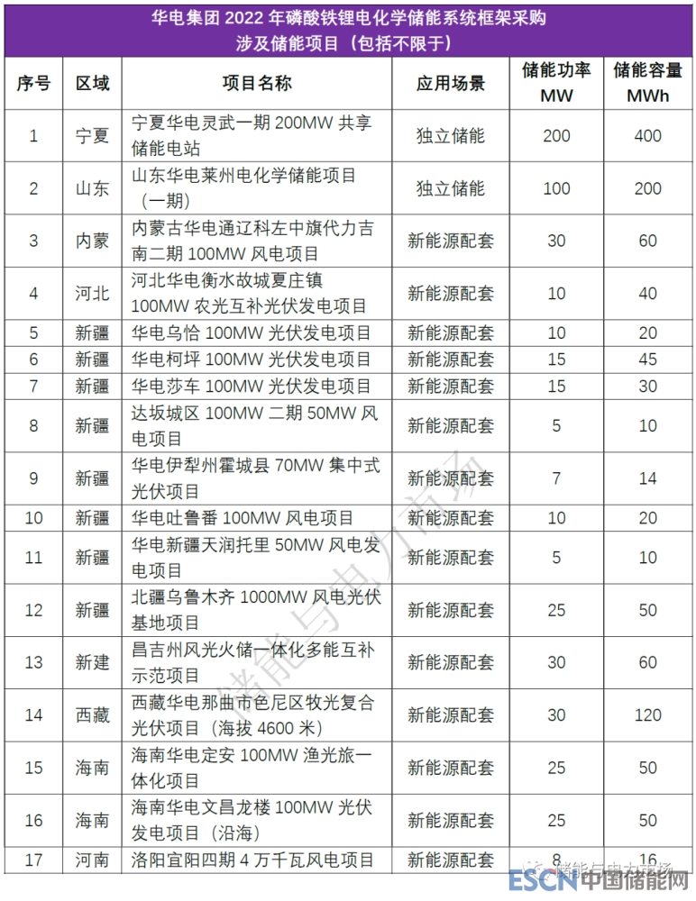 預(yù)采購(gòu)的1.4GWh儲(chǔ)能系統(tǒng),將用于華電集團(tuán)多個(gè)儲(chǔ)能項(xiàng)目,包括不限于以下17個(gè)獨(dú)立、新能源配儲(chǔ)項(xiàng)目。