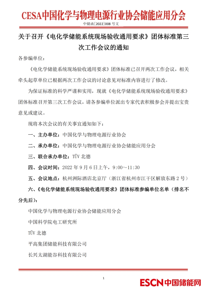 關(guān)于召開《電化學(xué)儲能系統(tǒng)現(xiàn)場驗(yàn)收通用要求》團(tuán)體標(biāo)準(zhǔn)第三次工作會議的通知