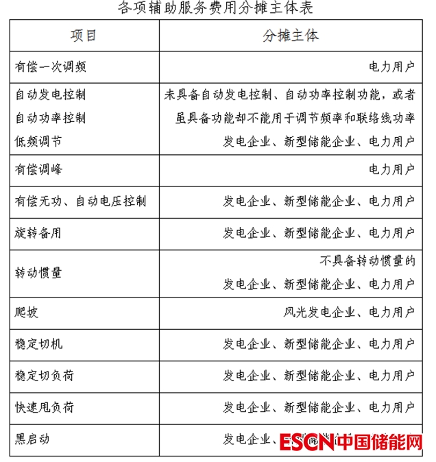 4.用戶側(cè)分?jǐn)偙壤@著增加。原則上,為了保障電網(wǎng)總體安全的頻率、電壓、備用、轉(zhuǎn)動(dòng)慣量、穩(wěn)定切機(jī)、快速甩負(fù)荷、黑啟動(dòng)等項(xiàng)目由發(fā)電企業(yè)、新型儲(chǔ)能企業(yè)、電力用戶共同承擔(dān);已經(jīng)提供該分項(xiàng)無(wú)償、有償輔助服務(wù)或參與該分項(xiàng)并網(wǎng)運(yùn)行考核的,不重復(fù)承擔(dān)相應(yīng)輔助服務(wù)費(fèi)用;為特定主體提供的輔助服務(wù)由特定主體承擔(dān),如下表所示。相對(duì)于以往電源側(cè)“零和游戲”的方式,由于有償一次調(diào)頻、自動(dòng)發(fā)電控制、有償調(diào)峰、轉(zhuǎn)動(dòng)慣量等輔助服務(wù)品種中電力用戶(包括電網(wǎng)企業(yè)代理購(gòu)電在內(nèi)的所有工商業(yè)用戶)都是分?jǐn)傊黧w,導(dǎo)致用戶側(cè)分?jǐn)偙壤^大,而兼具部分負(fù)荷特點(diǎn)的抽水蓄能、獨(dú)立儲(chǔ)能、新型儲(chǔ)能分?jǐn)偙壤草^大。