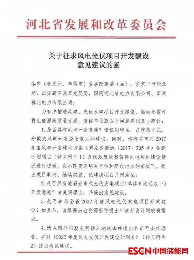 在征求意見函中,河北省發(fā)改委要求各地主管部門就風(fēng)電、地面分布式光伏開發(fā)意愿進(jìn)行說明,并請(qǐng)電網(wǎng)公司就電網(wǎng)接入消納條件提出各市可安排容量,并對(duì)《2022年度風(fēng)電光伏開發(fā)建設(shè)計(jì)劃表》提出意見建議。