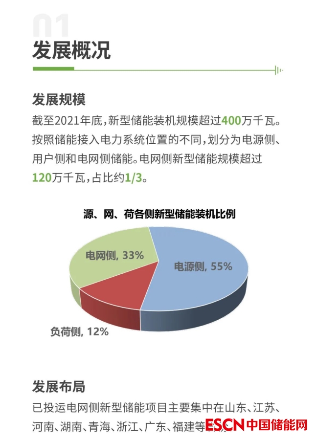 中國儲能網(wǎng)訊:近日,電規(guī)總院發(fā)布了《電網(wǎng)側新型儲能發(fā)展需求分析》PPT。PPT顯示截至2021年底,新型儲能裝機規(guī)模超過400萬千瓦。按照儲能接入電力系統(tǒng)位置的不同,劃分為電源側、用戶側和電網(wǎng)側儲能。電網(wǎng)側新型儲能規(guī)模超過120萬千瓦,占比約1/3。已投運電網(wǎng)側新型儲能項目主要集中在山東、江蘇、河南、湖南、青海、浙江、廣東、福建等省份。