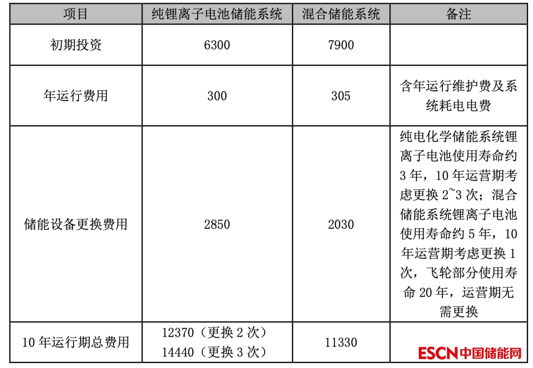 混合儲能系統(tǒng)在初期投資略高于純鋰離子電池儲能系統(tǒng),但考慮到運(yùn)營期內(nèi)儲能設(shè)備的更換費(fèi)用,則10年總運(yùn)營期內(nèi)混合儲能系統(tǒng)的總成本比純鋰離子電池儲能系統(tǒng)的成本低。