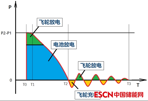 混合儲能系統(tǒng)工作機(jī)制為:當(dāng)混合儲能系統(tǒng)接受到AGC指令時(shí),飛輪與鋰離子電池混合儲能立即進(jìn)行放(充)電響應(yīng),在發(fā)電機(jī)組的出力沒有響應(yīng)之前,混合儲能系統(tǒng)以額定功率出力支撐,飛輪儲能在這個(gè)時(shí)段將儲電完全釋放(或充滿)后退出,當(dāng)機(jī)組進(jìn)入平穩(wěn)運(yùn)行階段(T2至T3時(shí)段)時(shí),鋰離子電池儲能退出,飛輪再次啟動(dòng)并快速充電(放電),修正火電機(jī)組出力與AGC調(diào)度指令之間偏差,直至本次指令結(jié)束。