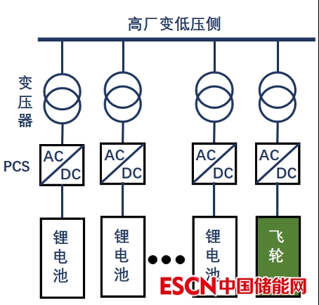 混合儲能調(diào)頻系統(tǒng)由儲能單元、儲能變流器(PCS)、變壓器、配電設(shè)施等組成。儲能單元采用飛輪與鋰離子電池兩種儲能技術(shù),飛輪和鋰離子電池儲能按一定的比例搭配,組成混合儲能系統(tǒng)共同輔助發(fā)電機(jī)組響應(yīng)AGC調(diào)頻指令。飛輪儲能系統(tǒng)功率密度大,壽命長,適合短時(shí)大功率、頻繁地充放電場景。鋰離子電池儲能系統(tǒng)能量密度大,適合較長時(shí)間的功率和能量支撐,通過結(jié)合兩種儲能系統(tǒng)的優(yōu)點(diǎn),可提升儲能系統(tǒng)的調(diào)頻性能、壽命,進(jìn)而實(shí)現(xiàn)經(jīng)濟(jì)收益的最大化。