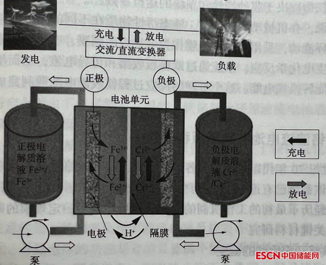 充放電過程中,電解液通過循環(huán)泵進(jìn)入兩個(gè)半電池中,F(xiàn)e3+/Fe2+電對(duì)和Cr3+/Cr2+電對(duì)分別在電極表面進(jìn)行氧化還原反應(yīng),正極釋放電子通過外電路傳遞到負(fù)極,電池內(nèi)部通過離子在溶液內(nèi)移動(dòng),并與離子交換膜進(jìn)行質(zhì)子交換,形成完整回路。