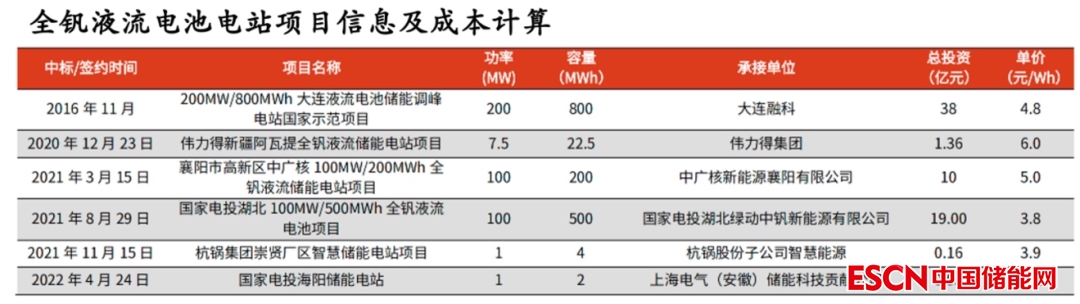 釩電池目前最為人詬病的就是其高昂的初裝成本(比鋰電池高一倍),根據(jù)已有的全釩電池電站項(xiàng)目信息可以算出,項(xiàng)目總投資成本集中在3.8-6元/Wh。與之相比的鋰電池單位投資成本約2元/Wh。