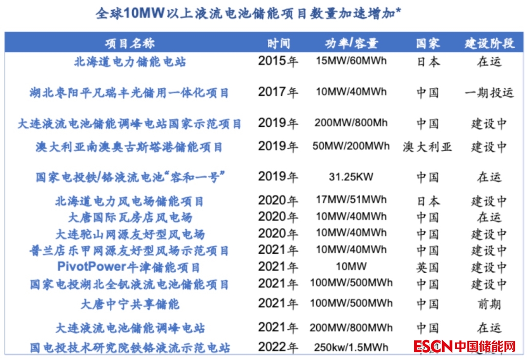 可以看到,2020年之后10MW以上的液流電池儲(chǔ)能項(xiàng)目出現(xiàn)井噴式增長。尤其是國家能源局批準(zhǔn)建設(shè)的首個(gè)國家級(jí)大型化學(xué)儲(chǔ)能示范項(xiàng)目——大連液流電池儲(chǔ)能調(diào)峰電站(全釩) 的建設(shè)規(guī)模達(dá)到了200MW,總投資38億元。第一期工程已建設(shè)完成,于今年5月正式接入遼寧電網(wǎng),正式進(jìn)入商業(yè)化運(yùn)行階段。