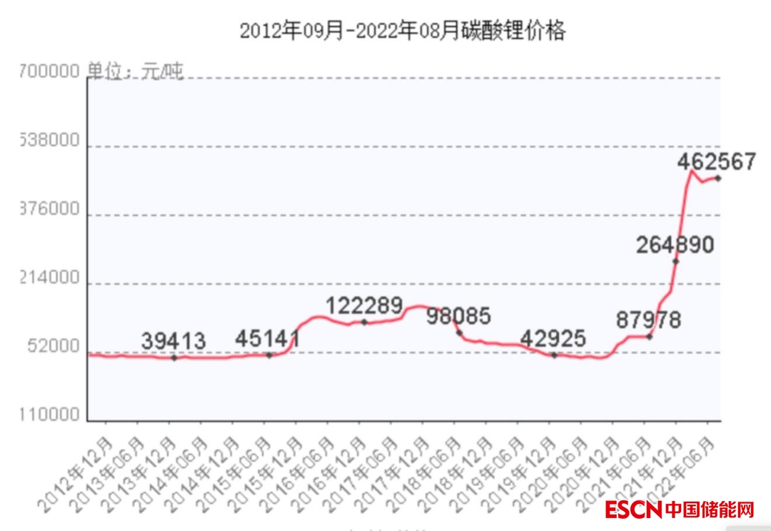 磷酸鐵鋰電池不光在儲(chǔ)能中是主流路線,在新能源車中也是。在近幾年新能源車和儲(chǔ)能的強(qiáng)勢合攻下,上游碳酸鋰價(jià)格已經(jīng)從2020年的4.3萬元/噸上漲到了如今的46萬元/噸,并維持在高位。