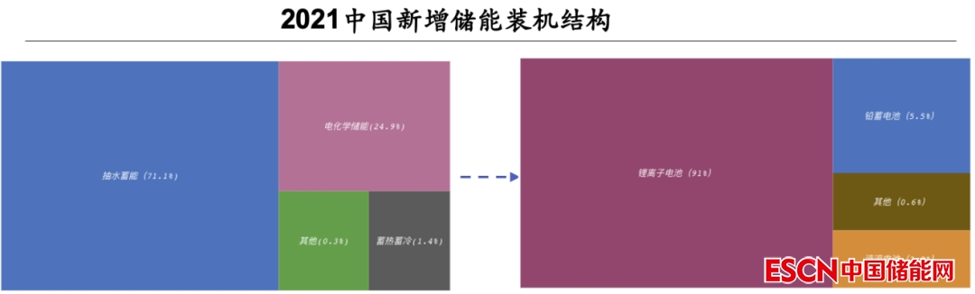 目前,短時(shí)儲(chǔ)能的鋰離子電池和長時(shí)儲(chǔ)能的抽水蓄能方案在市場中的主導(dǎo)地位非常明顯。根據(jù)《2022儲(chǔ)能產(chǎn)業(yè)應(yīng)用研究報(bào)告》的數(shù)據(jù),在2021年中國新增儲(chǔ)能裝機(jī)結(jié)構(gòu)中,抽水蓄能占據(jù)71%的份額,而在新裝機(jī)的電化學(xué)儲(chǔ)能中,鋰離子電池占據(jù)了91%的份額。