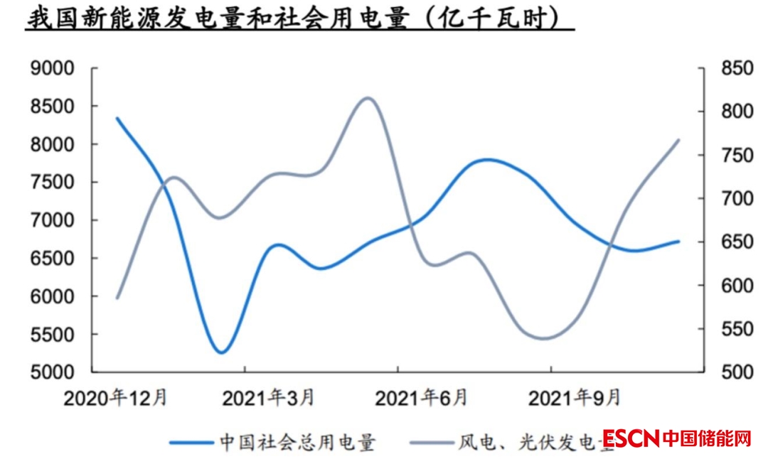 全社會(huì)用電量7-9月和12月是高峰,2-4及11月是低谷。而風(fēng)電和光伏發(fā)電量3-5月及11月是高峰,兩者峰谷錯(cuò)位。