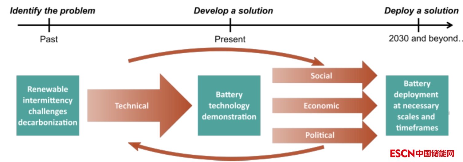根據(jù)國際能源署的預測,到2030年,二氧化碳排放量的大部分減少將來自當今市場上已經(jīng)部署或上市的技術,到2050年,大約一半的碳減排量將依賴于目前處于示范或原型階段的能源技術。因此,政府和社會在技術上正走在應對氣候變化的正確道路上。然而,還有許多其他潛在的社會、經(jīng)濟和政治障礙需要克服,以確保以足夠快的速度部署最佳能源技術,以使這些減少的幅度足以防止更大規(guī)模的損害(圖1)。雖然這些考慮因素并不獨立于技術方面,但它們可能需要不同的方法和解決方案。這項工作探討了在更廣泛的電池部署中的兩個關鍵挑戰(zhàn):電池成本和材料限制。一系列具有合適性能特征的電池技術已經(jīng)存在,但高昂的前期成本可能會延遲或阻礙更廣泛的采用,特別是在目前的低生產(chǎn)規(guī)模下。最后,即使特定的電池技術滿足必要的成本和性能指標,其關鍵元件的可用性和供應鏈也可能會阻礙快速和深度集成。因此,必須盡快解決這些問題,以實現(xiàn)關鍵的脫碳目標。這項工作探討了克服或規(guī)避這些障礙的經(jīng)濟和政治策略。