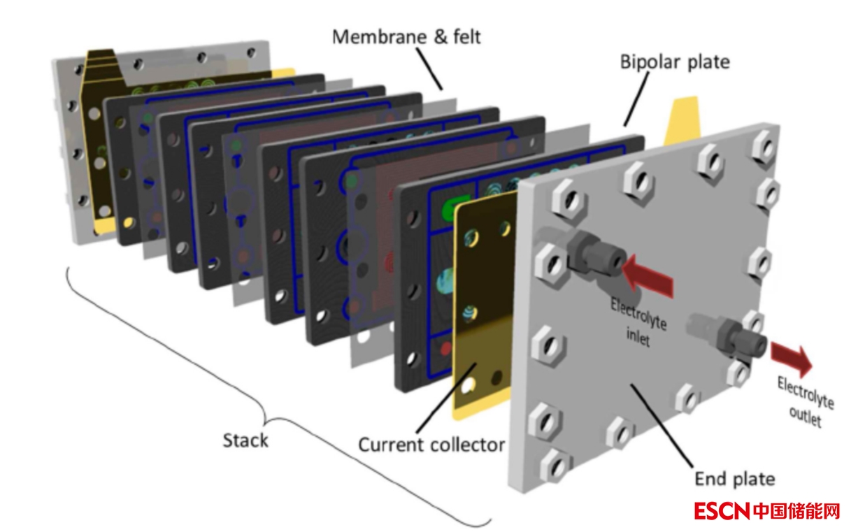 圖2氧化還原液流電池(RFB)結構分解圖。而金屬空氣電池、燃料電池和電解槽其他技術也采用了這種基本的“三明治”型結構。