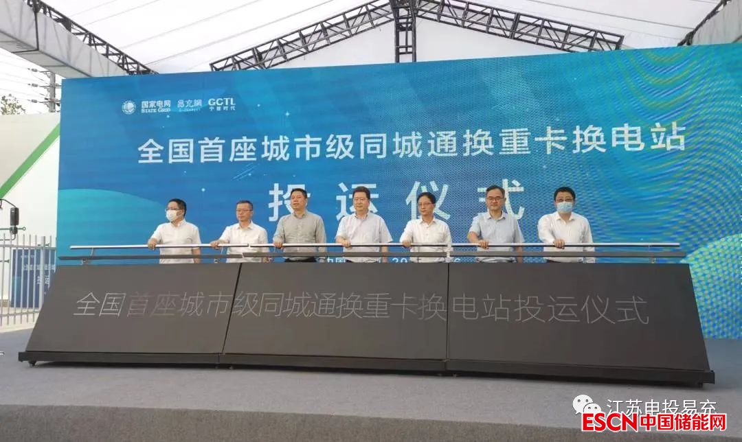 中國儲能網(wǎng)訊:2022年9月16日下午,全國首批“同城通換”重卡換電站投運(yùn)儀式在南京市棲霞區(qū)普洛斯龍?zhí)吨乜〒Q電站內(nèi)隆重舉行,本次投運(yùn)儀式由國網(wǎng)江蘇電動汽車服務(wù)有限公司、江蘇電投易充新能源科技有限公司、寧普易充(江蘇)新能源科技有限公司聯(lián)合主辦。來自國家、省、市政府主管部門、行業(yè)權(quán)威專家與研究機(jī)構(gòu)、換電生態(tài)企業(yè)等代表約100人出席了此次活動。