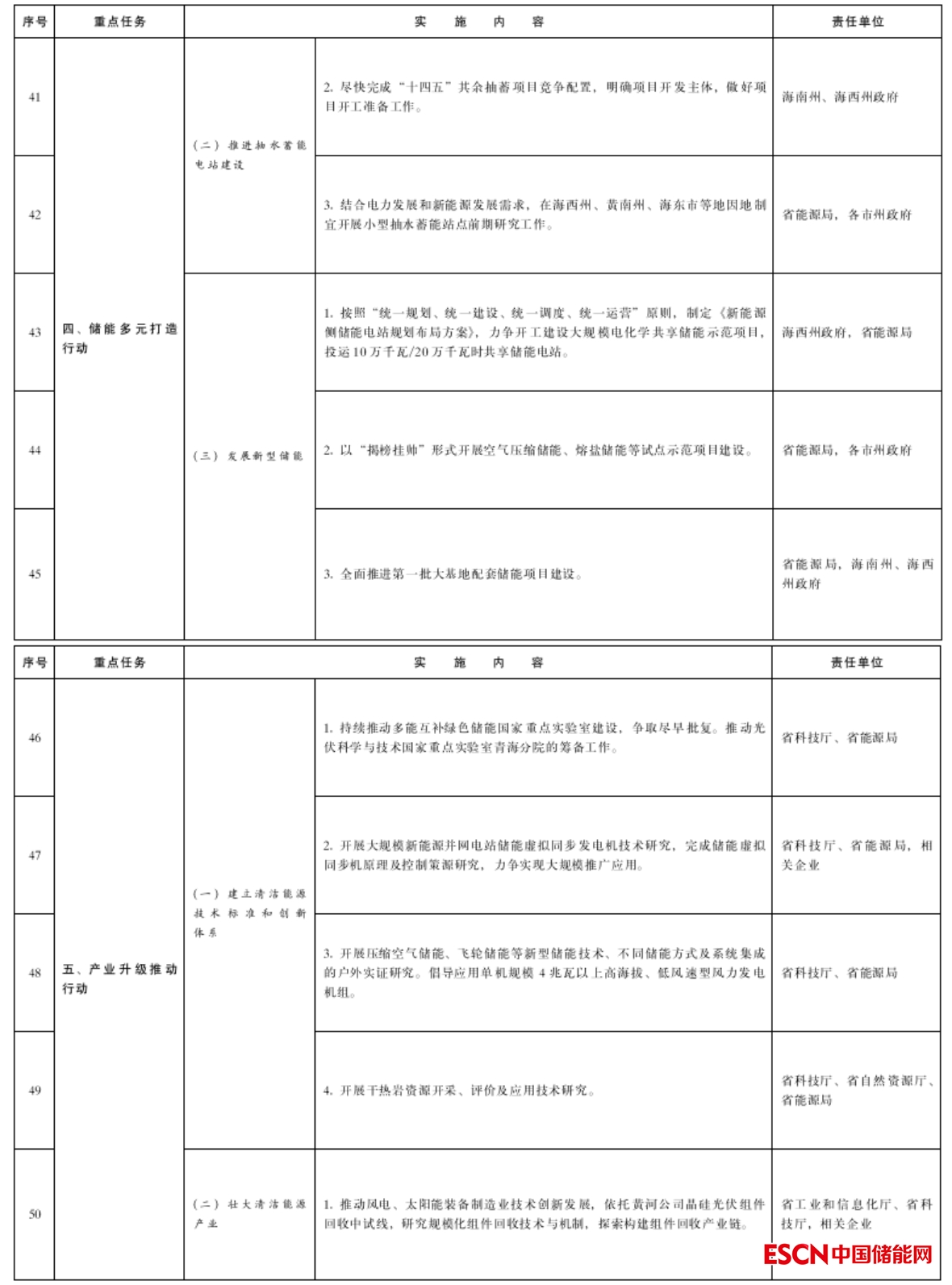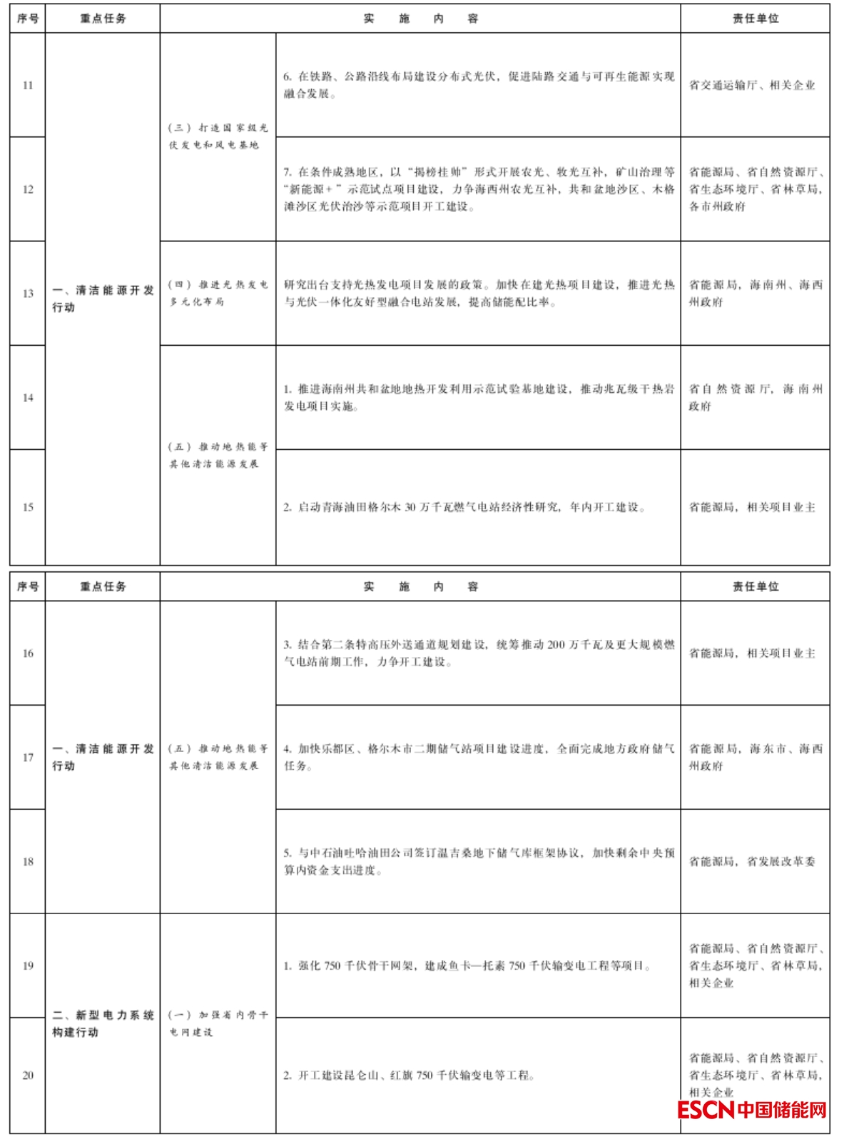 (三)發(fā)展新型儲能。按照“統(tǒng)一規(guī)劃、統(tǒng)一建設(shè)、統(tǒng)一調(diào)度、統(tǒng)一運營”原則,制定《新能源側(cè)儲能電站規(guī)劃布局方案》,力爭開工建設(shè)大規(guī)模電化學(xué)共享儲能示范項目,投運10萬千瓦/20萬千瓦時共享儲能電站。(省能源局,海西州政府)以“揭榜掛帥”形式開展空氣壓縮儲能、熔鹽儲能等試點示范項目建設(shè)。(省能源局,各市州政府)全面推進(jìn)第一批大基地配套儲能項目建設(shè)。(省能源局,海南州、海西州政府)